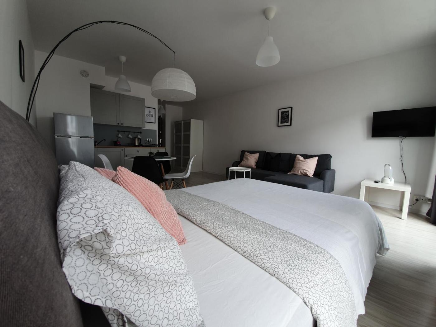Studio. The studio offers a washing machine and a dining area, as well as a private bathroom featuring a shower. In the fully equipped kitchenette, guests will find a stovetop, a refrigerator, kitchenware and an electric kettle. This studio features parquet floors, heating and a flat-screen TV. The unit offers 2 beds. Studio - 4 osobowy. Powierzchnia pokoju ok.: 23 mkw.